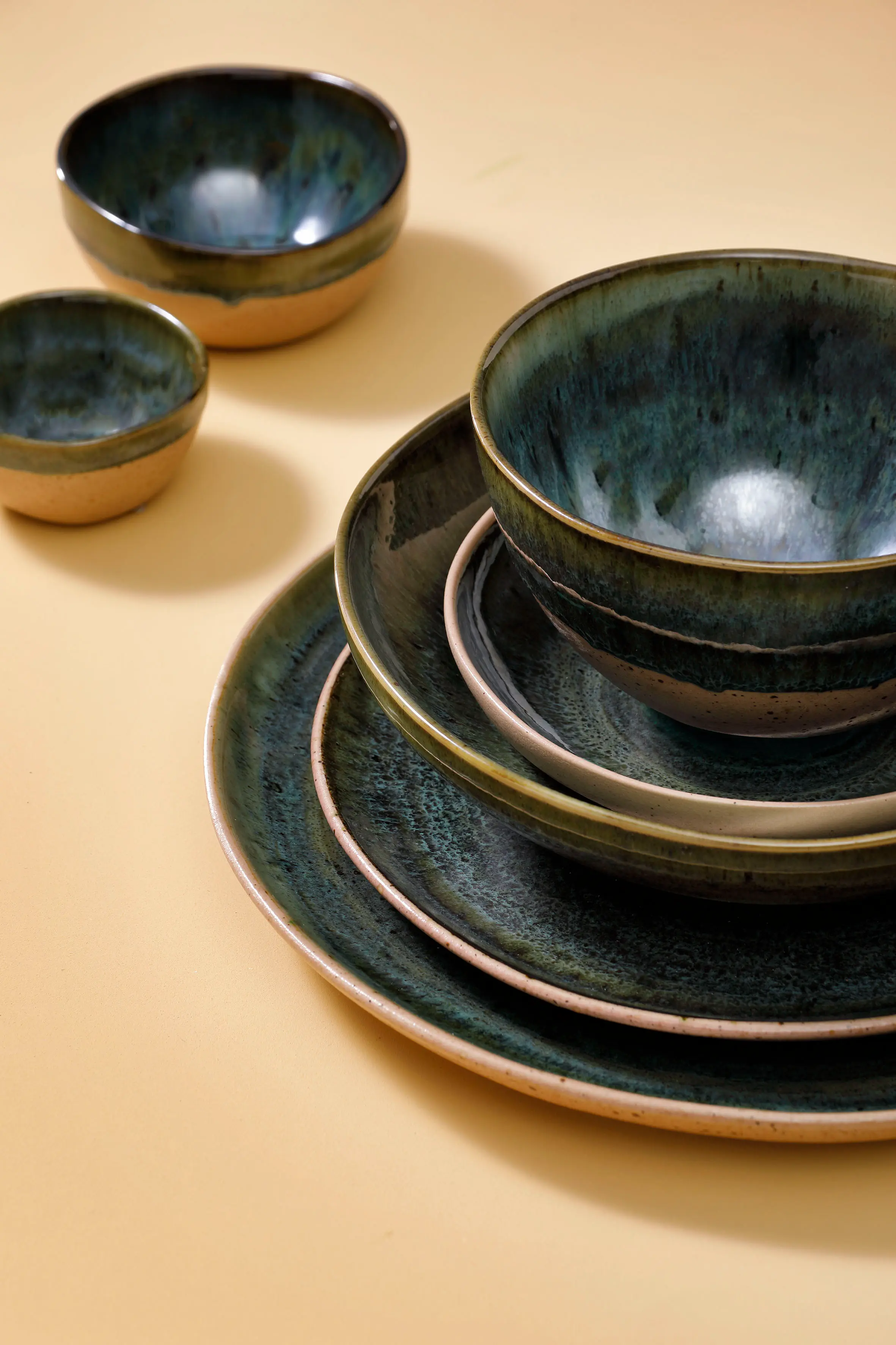 A verdant, shining green glaze effortlessly entwined with untouched stoneware is a natural wonder.